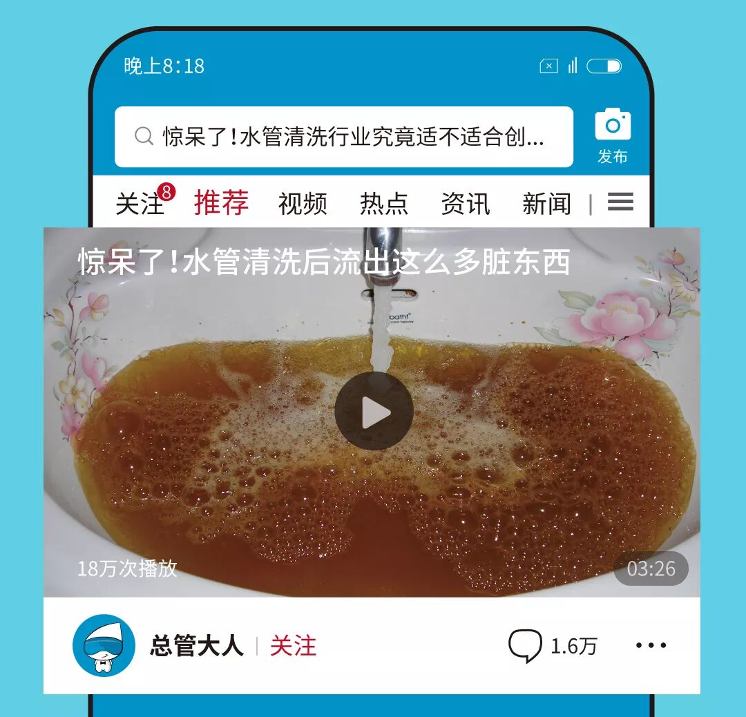 這類APP的播放量更多是通過自身系統(tǒng)的推薦機(jī)制來獲得。比如,今日頭條媒體平臺,企鵝媒體平臺,一點(diǎn)資訊等,這些平臺上的用戶會主動關(guān)心每日資訊,在家庭中也有一定的決策權(quán),在獲取資訊的時(shí)候,如果刷到清洗水管短視頻,很可能就會對家庭水管清潔有所重視。