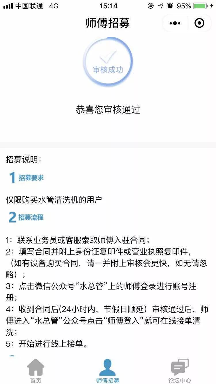 步驟四:收到合同后(24小時內(nèi),節(jié)假日順延)審核通過后,師傅進(jìn)入“水總管”公眾號點(diǎn)擊“師傅登入”就可在線接單清洗。