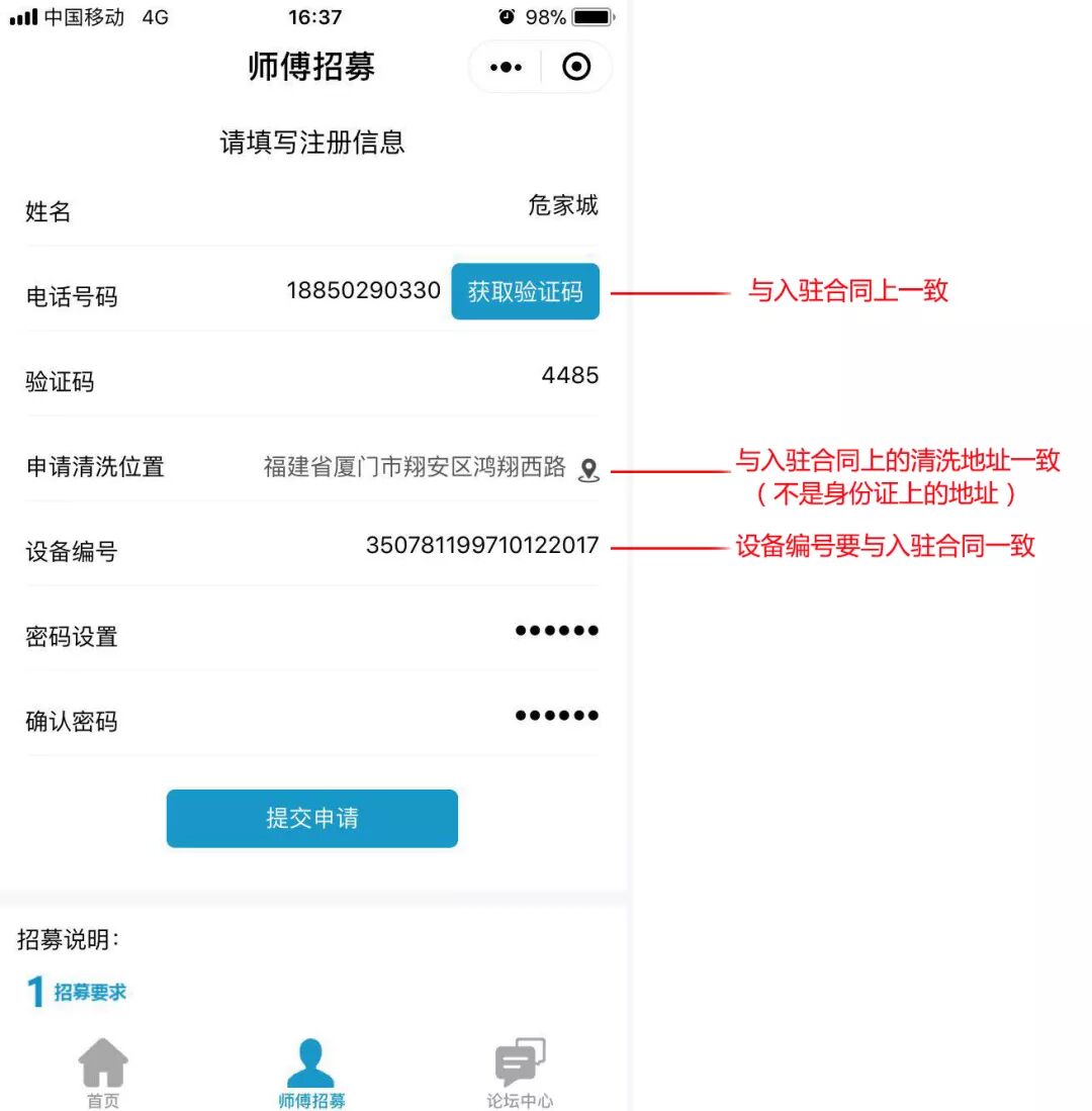 步驟二:業(yè)務(wù)員指導(dǎo)師傅在小程序平臺注冊師傅的填寫流程,填寫內(nèi)容與入駐合同上一致。