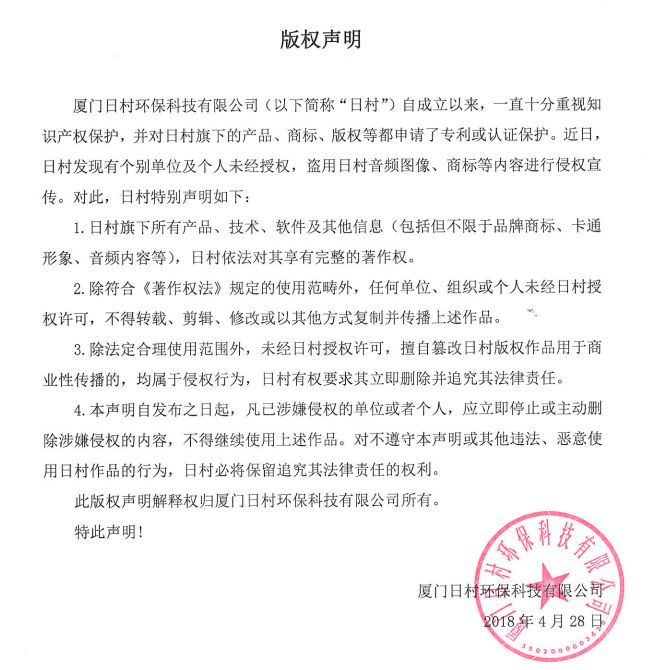 關(guān)于廈門日村環(huán)??萍加邢薰景鏅?quán)聲明
