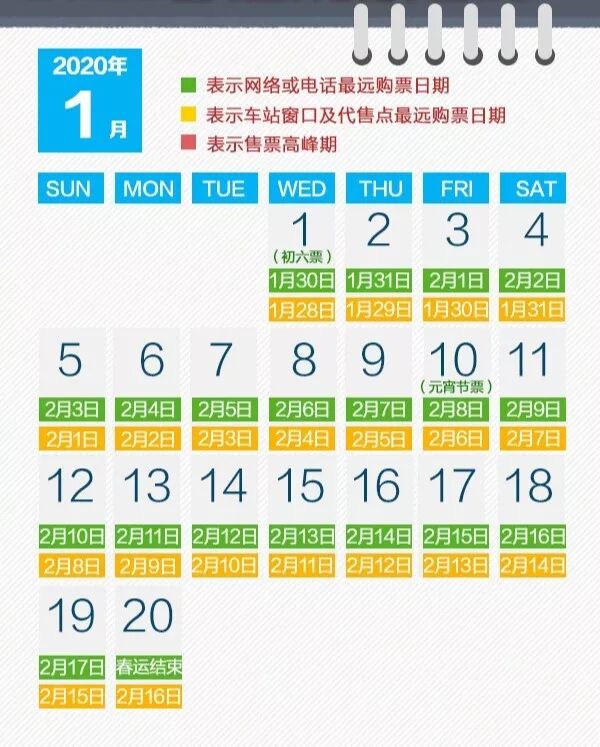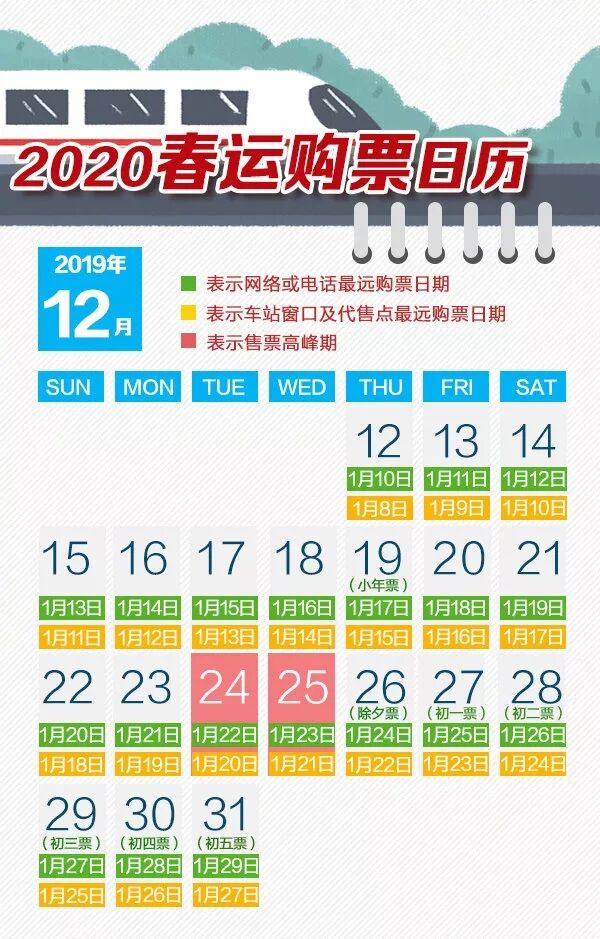 2020年的春運(yùn)時(shí)間:從2020年1月10日(臘月十六)開(kāi)始,到2020年2月18日(正月廿五)結(jié)束。12月12號(hào)即可買(mǎi)1月10日春運(yùn)首日的車票!