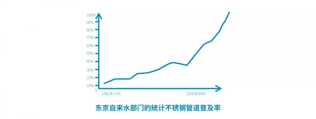 1999年東京供水局將不銹鋼波紋管作為標準用材,表明不銹鋼用作自來水輸水管道和建筑內(nèi)給水管道步入了標準化軌道。據(jù)東京自來水部門的統(tǒng)計,不銹鋼管道普及率從1982年的 11%,到2000年就已經(jīng)上升到了90%以上,現(xiàn)今更是接近100%。