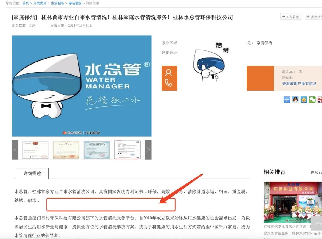 后來,李總無意中發(fā)現(xiàn)桂林本地的生活服務(wù)網(wǎng)做的非常好,每天有數(shù)百萬的點擊率,他就想:這是一個好平臺,可以在上面放廣告。然后,李總就開始從本地自有平臺入手,以最接地氣的方法向當?shù)鼐用襁M行水健康以及水管清洗相關(guān)知識的科普。