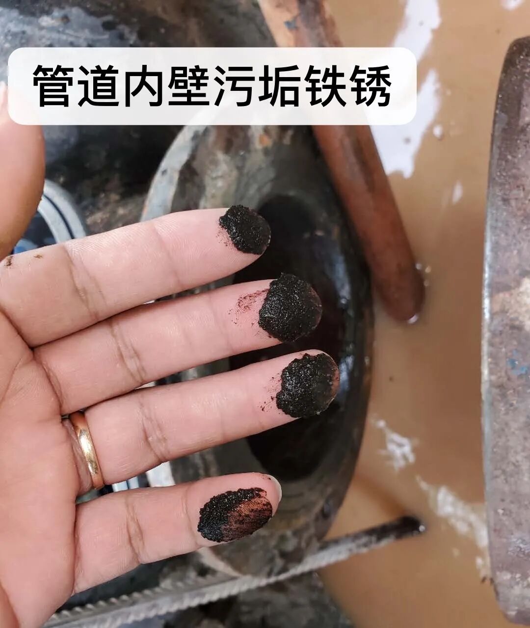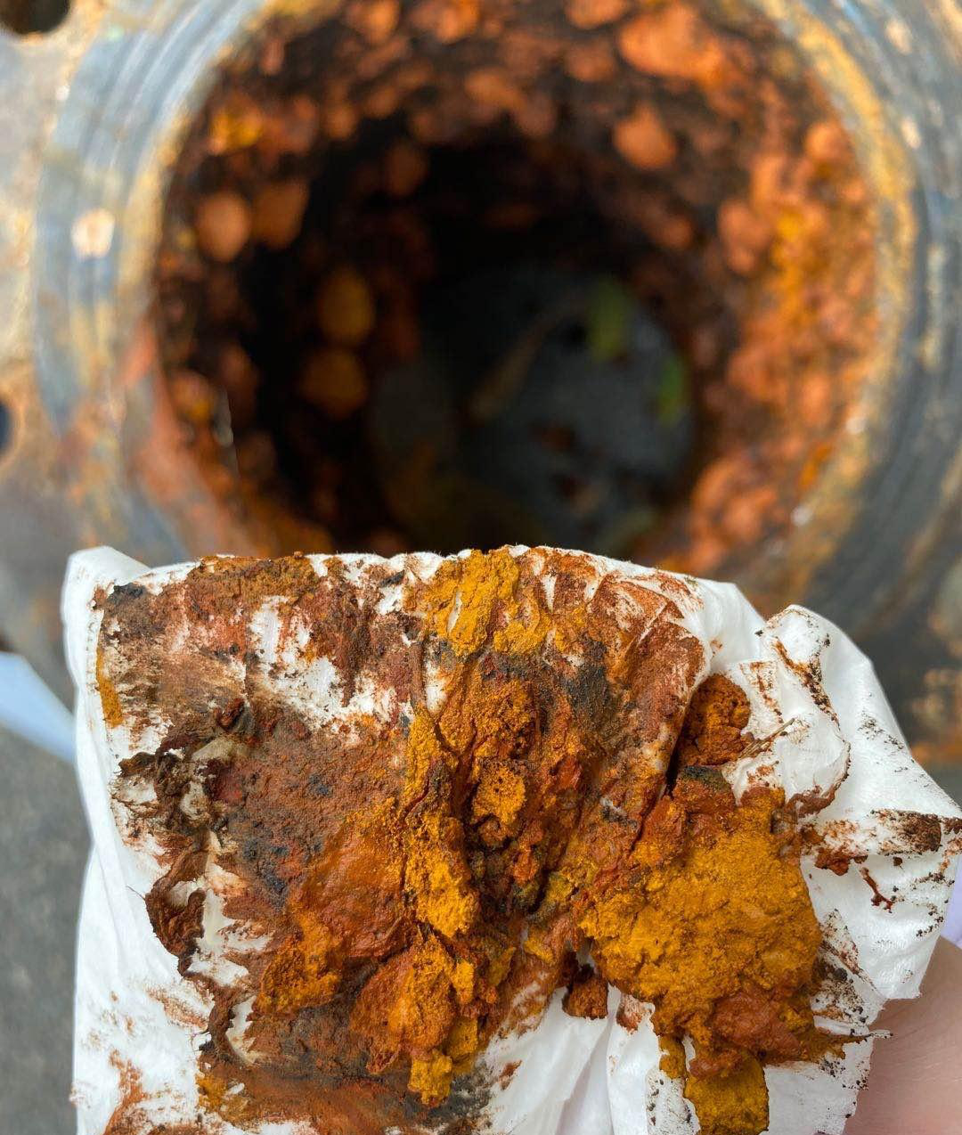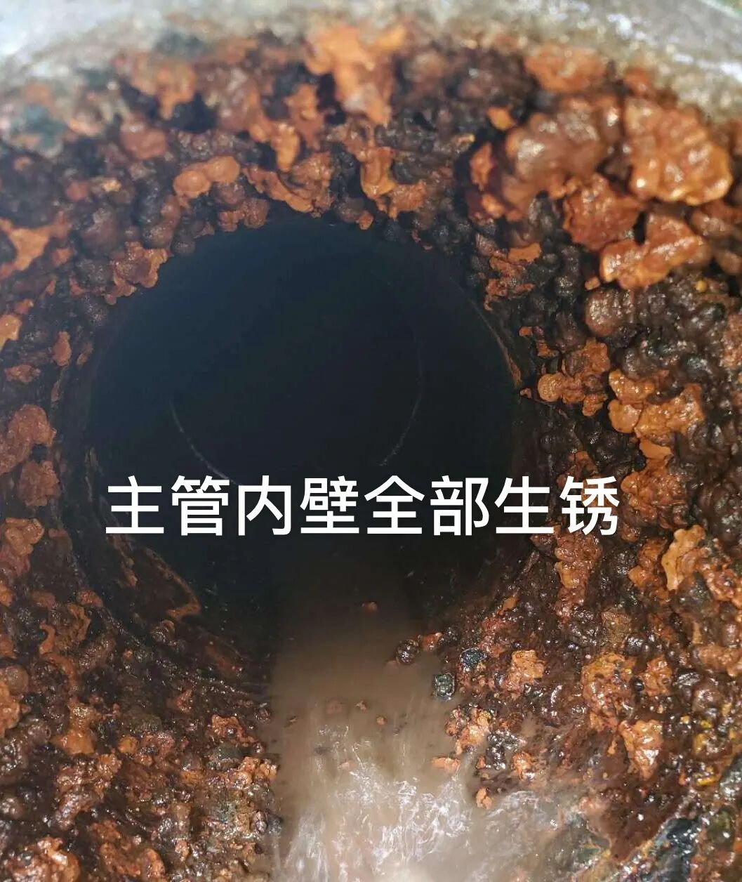 管道內(nèi)壁被腐蝕的凹凸不平,沾滿厚厚的一層鐵銹,明顯的發(fā)黑,輕輕一擦都是黃色的銹垢,觸目驚心。