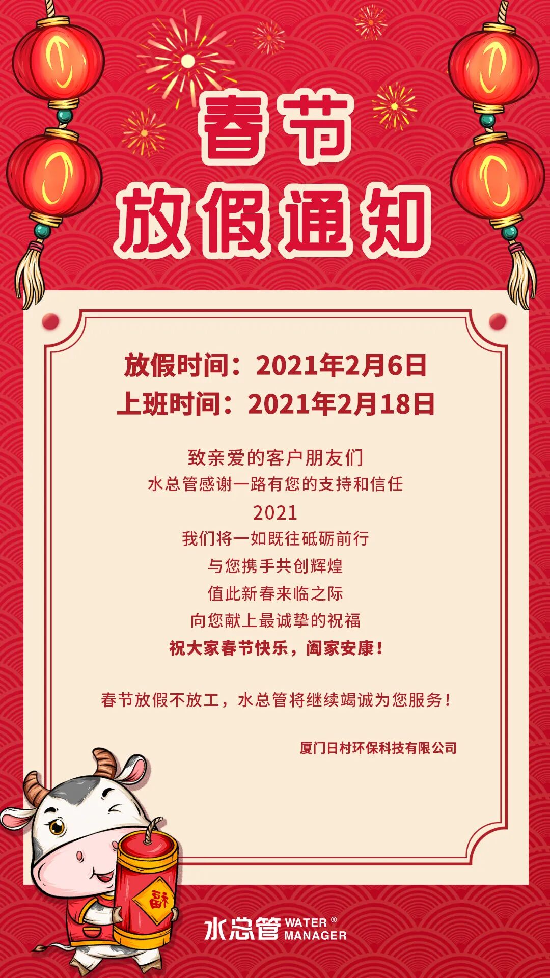 新春佳節(jié)來臨之際,水總管祝大家:身體健康,牛年大吉!