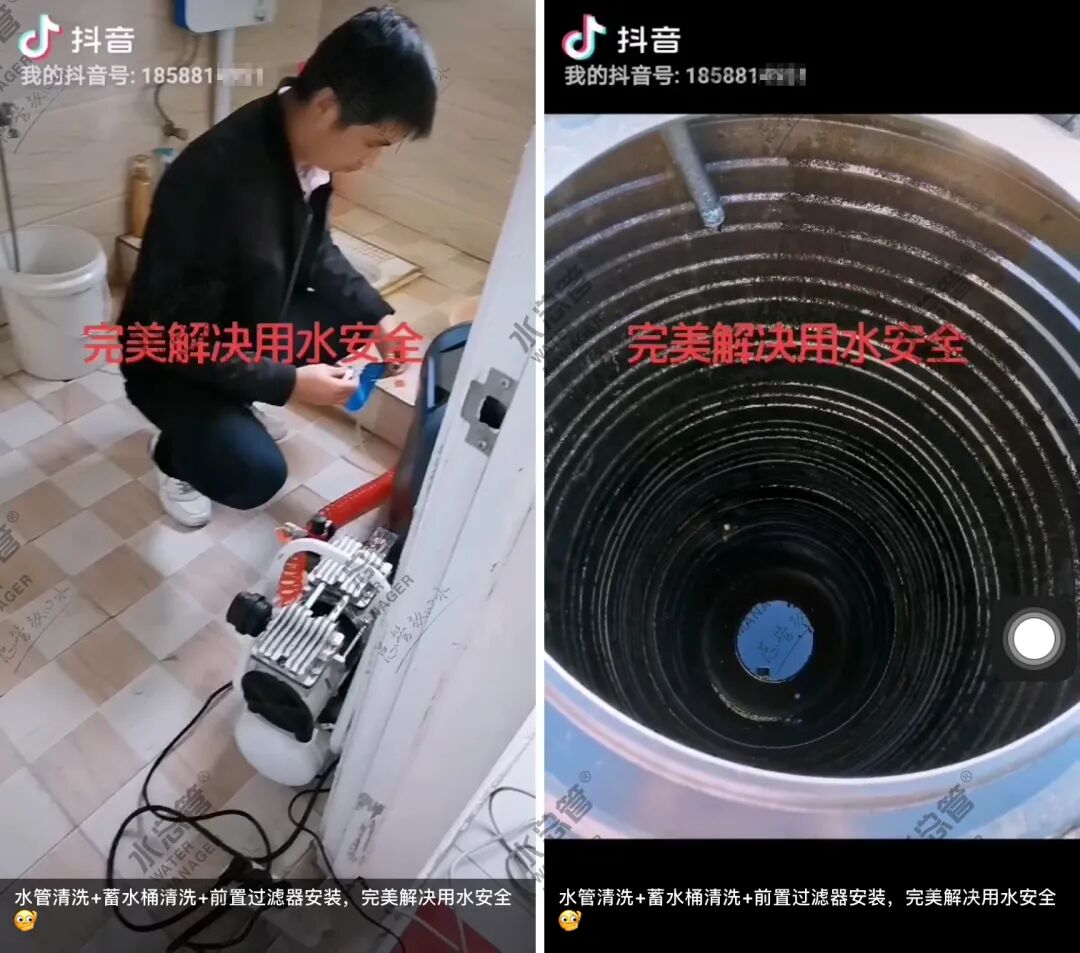 因?yàn)槭窃谵r(nóng)村縣城的地方,柯師傅的清洗自建房比較多。在講解清洗時(shí),經(jīng)常也會(huì)有鄰居來觀看,雖然大家不一定清洗,但自己親眼看到了洗出來的臟水,心里多少都有個(gè)健康飲水的意識(shí),對這一塊起碼會(huì)開始重視。
